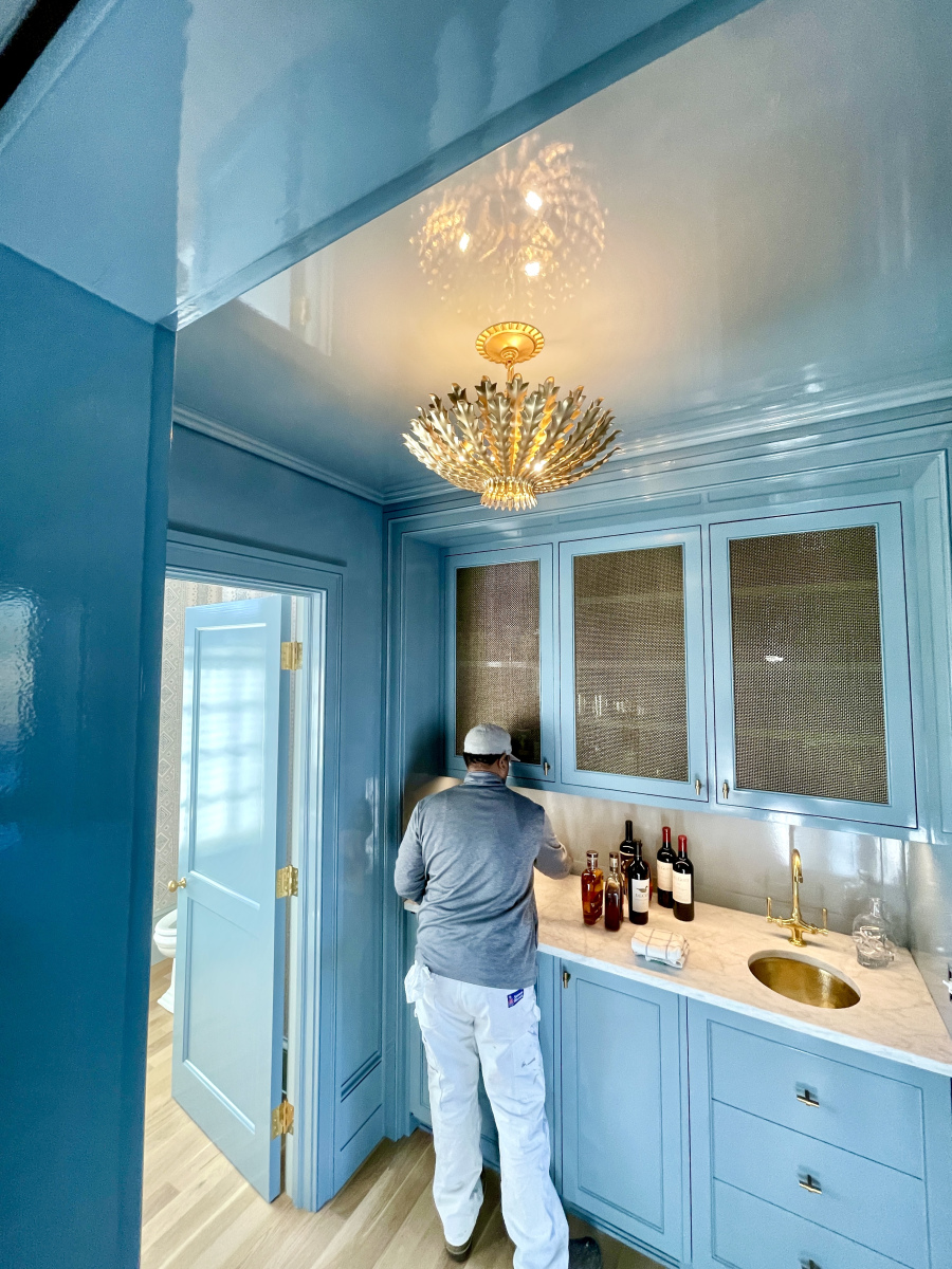 Depending upon the project and goals, we brush on high-gloss paint by hand or spray it on for the ultimate, mirror-like finish. Interestingly, applying these products with a roller does not yield good results.